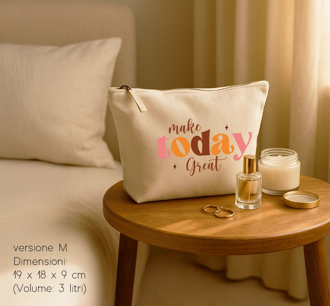 Le nostre pochette in cotone canvas naturale, morbide ma resistenti, sono perfette per organizzare trucchi, piccoli oggetti, accessori da viaggio o essentials quotidiani.